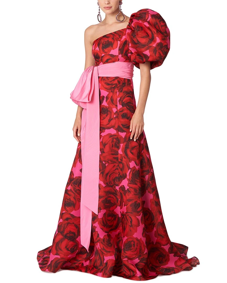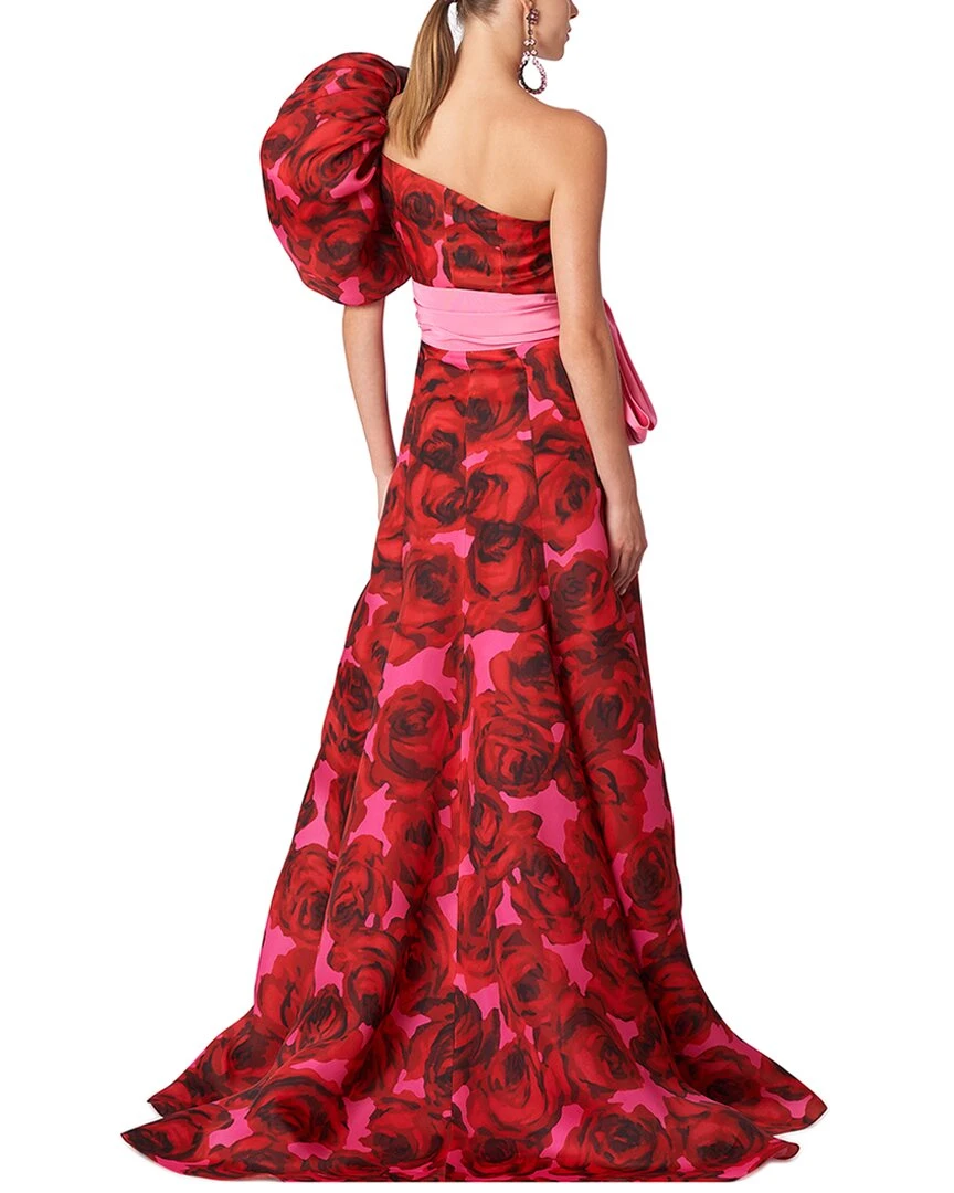 - One-Shoulder Puff Sleeve Silk Gown in icon red multicolor