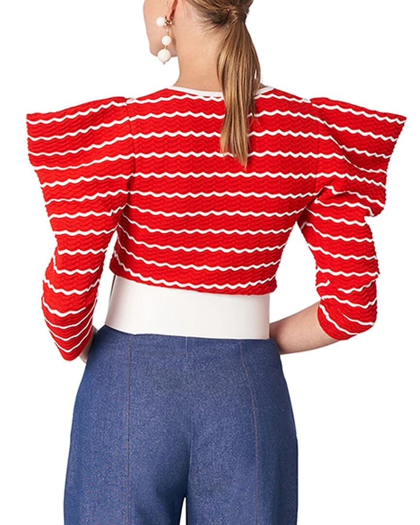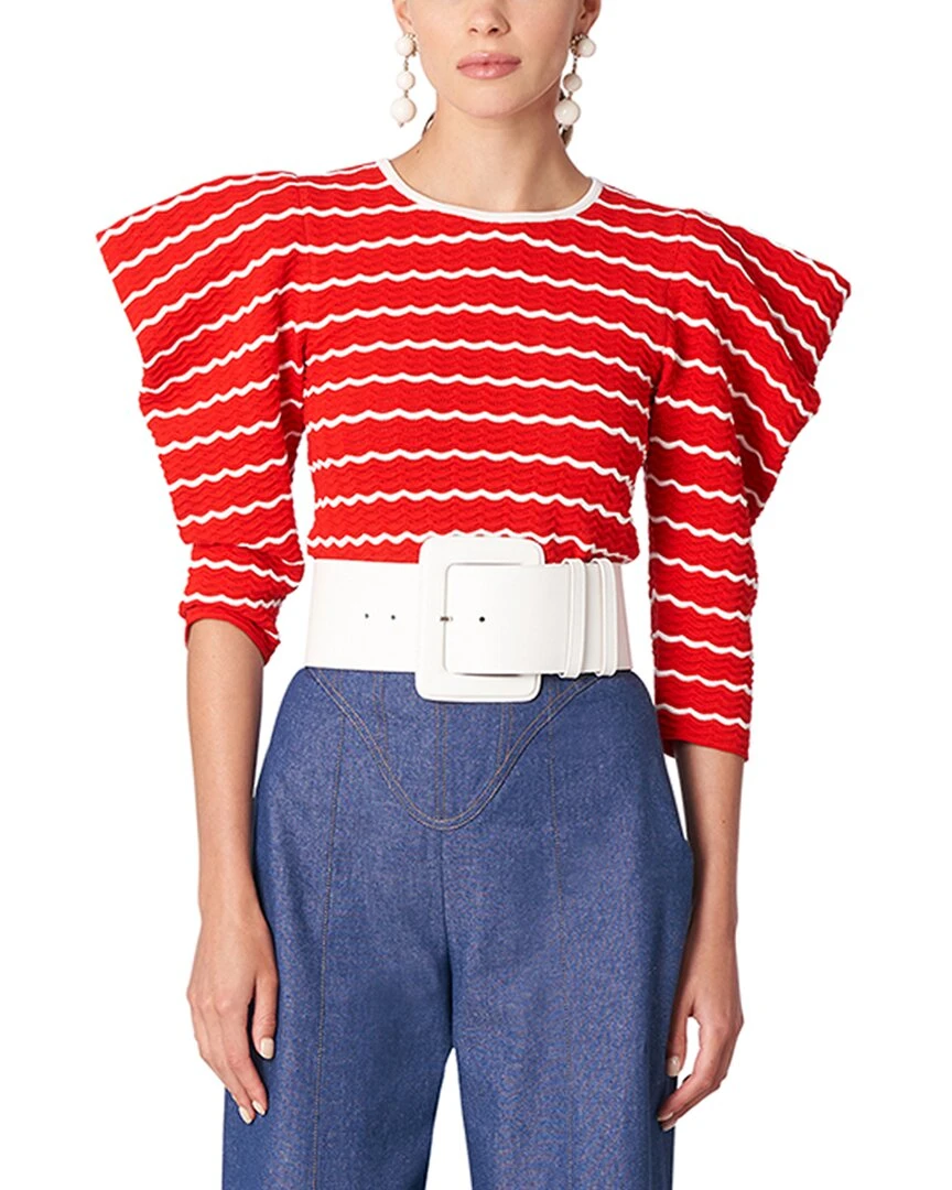 - Puff Sleeve Scallop Motif Knit Top in chili red multicolor
