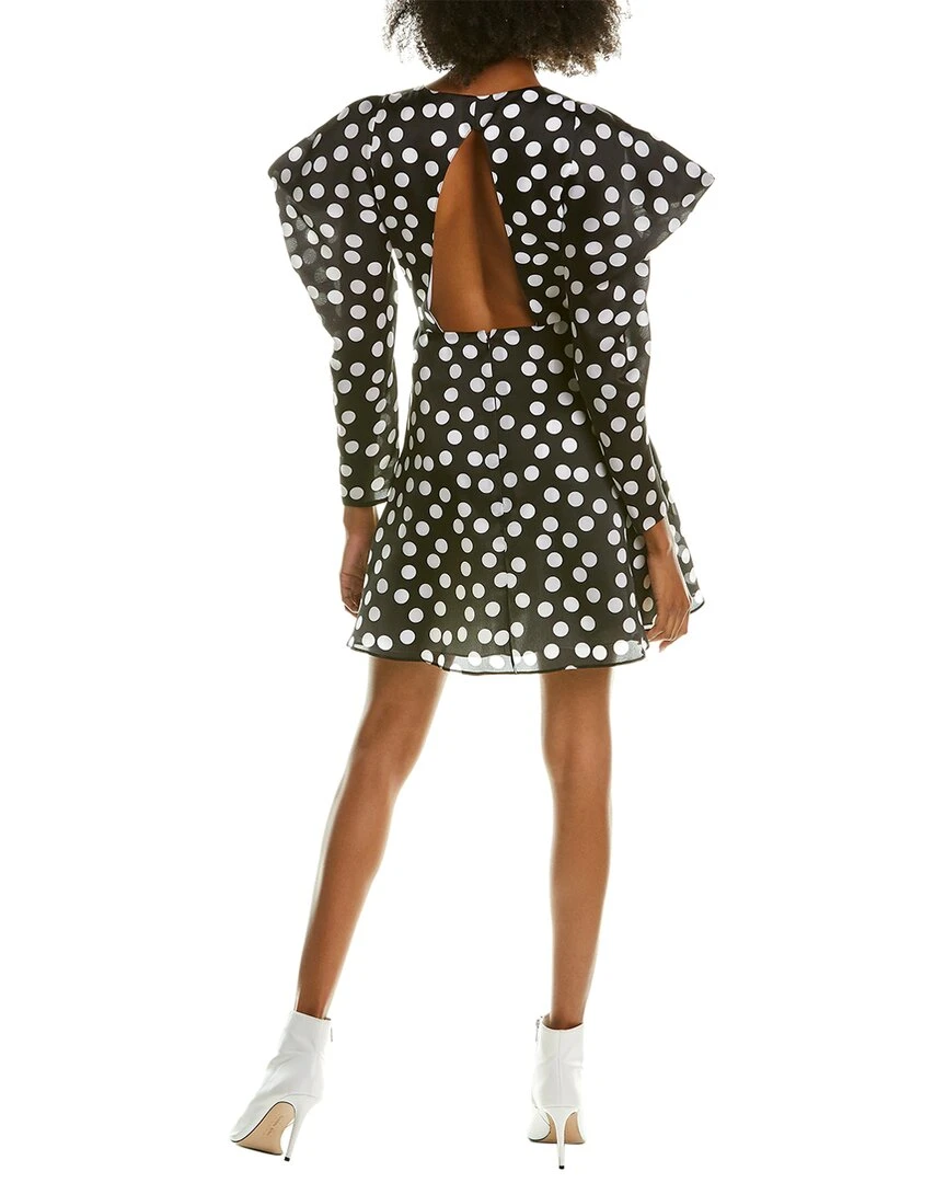 - Puff Sleeve Silk Mini Dress in black & white with square puffed shoulders, dual side on-seam pockets, and keyhole back