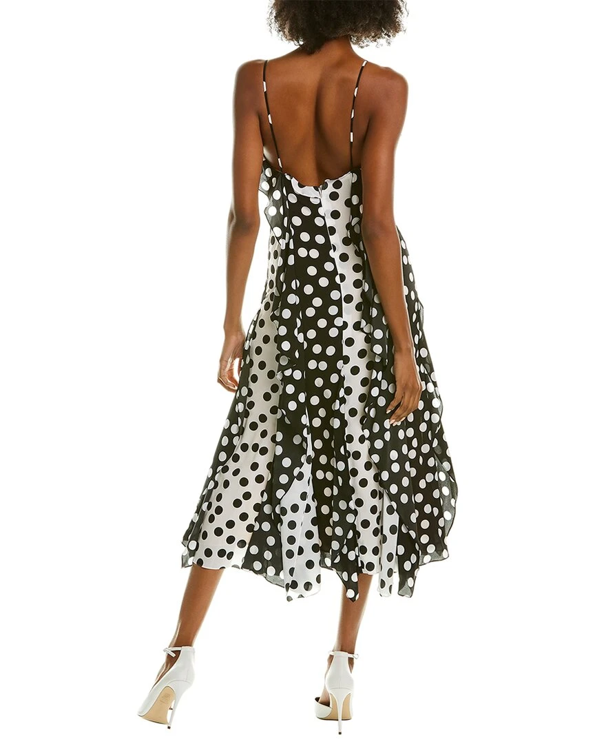 - Ruffle Midi Dress in black & white with colorblocked dot design, V-neck, and ruffled trim