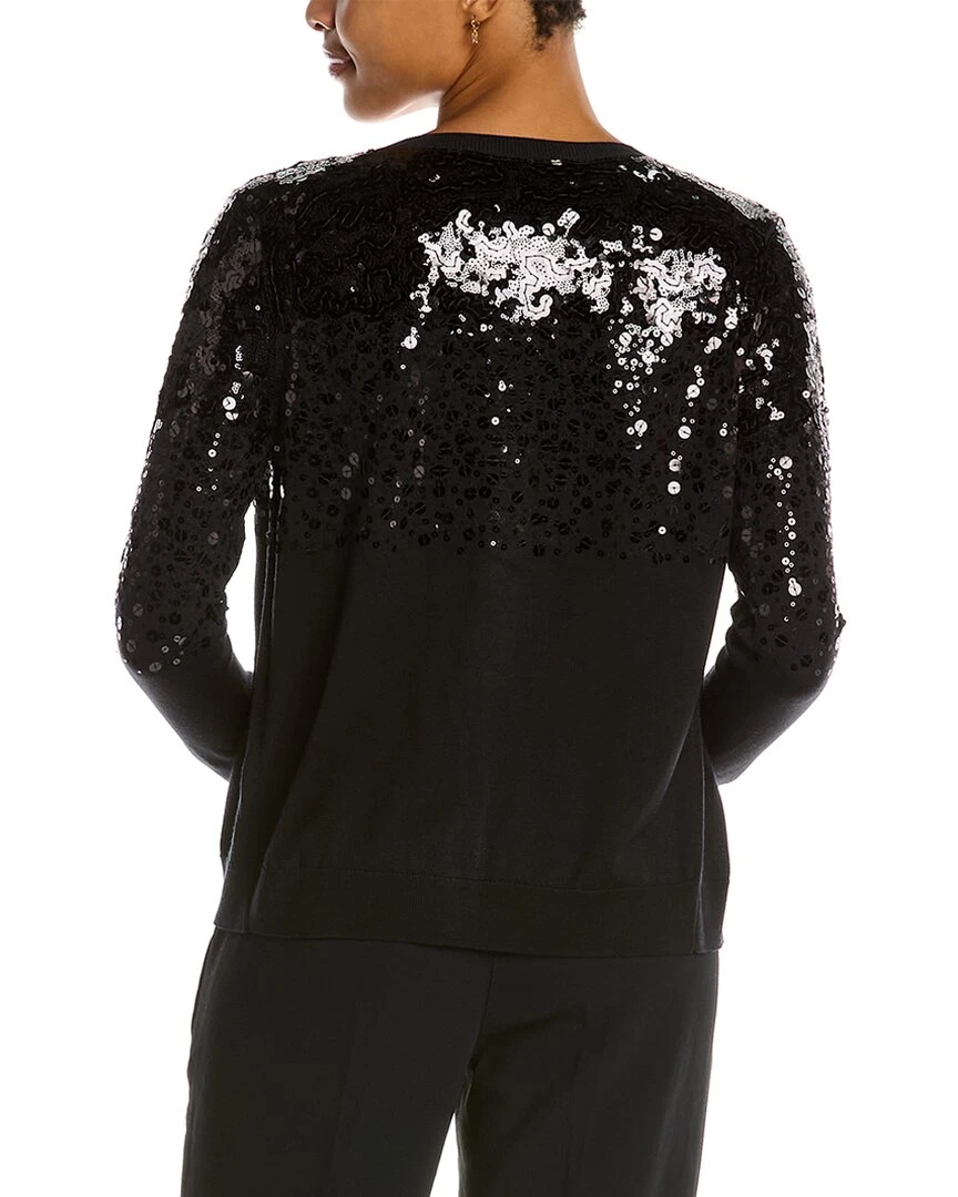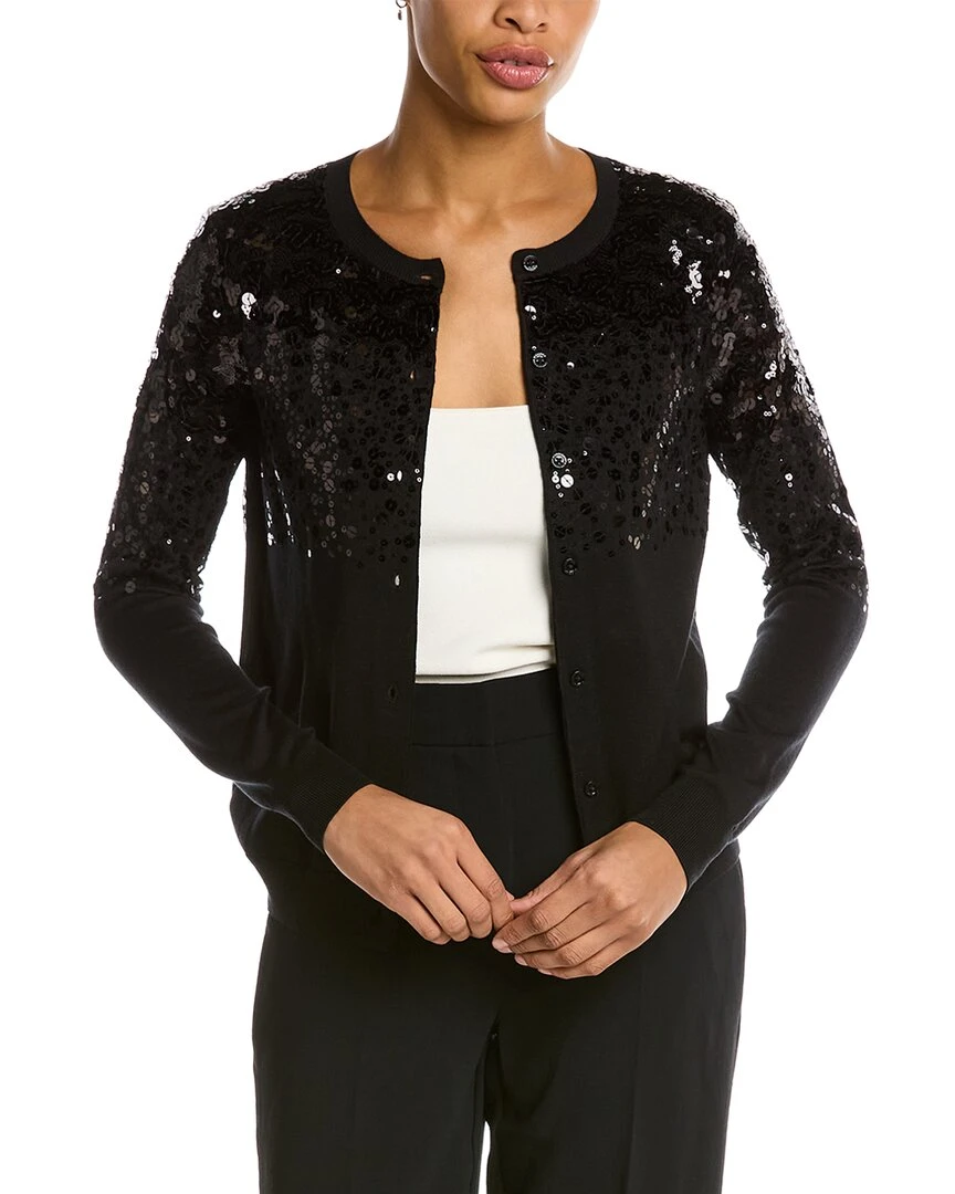 - Silk & Cashmere Blend Sequin Cardigan in black with crewneck and long sleeves