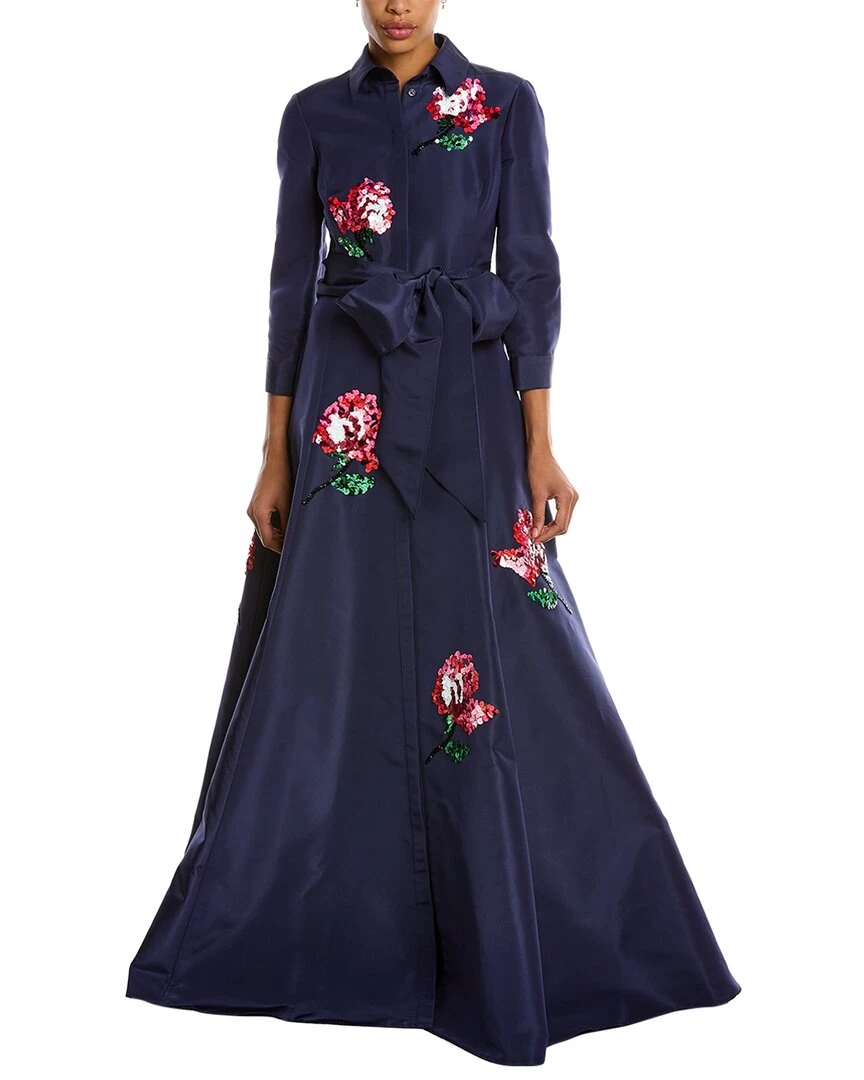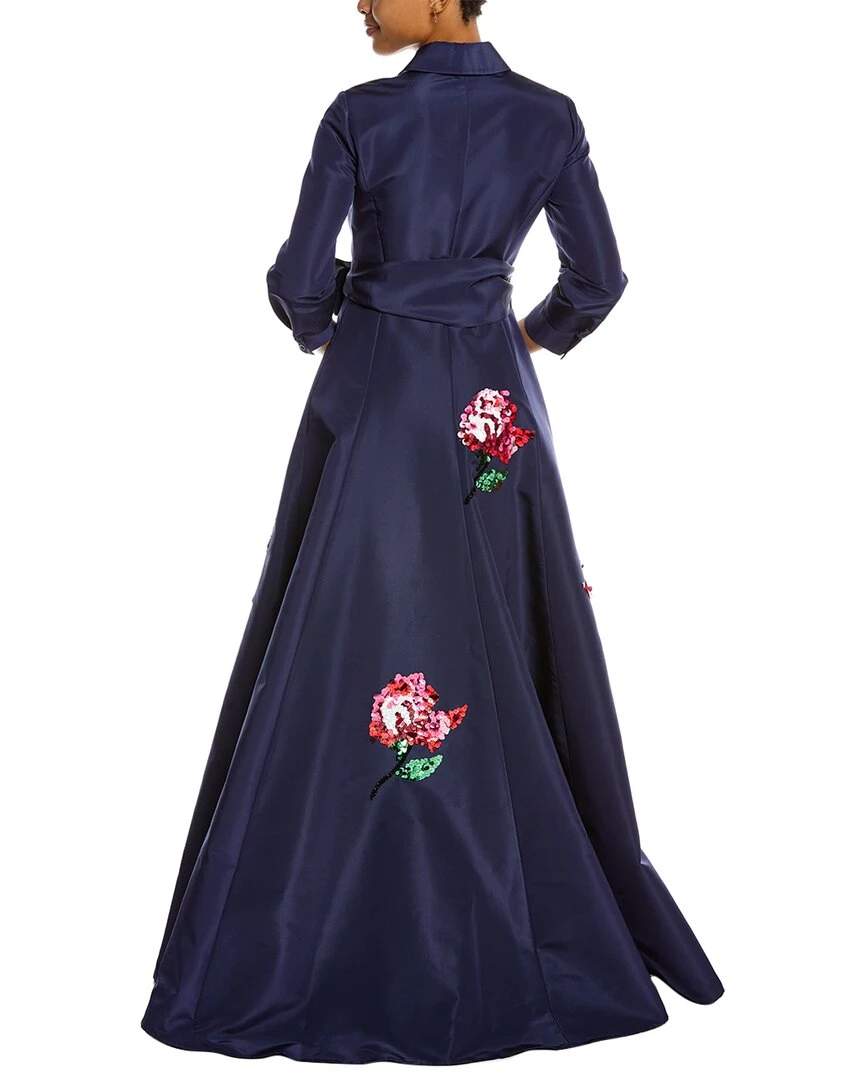 - Silk Trench Gown in navy with button sleeves, sequin embroidery, and tie at waist